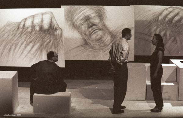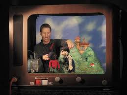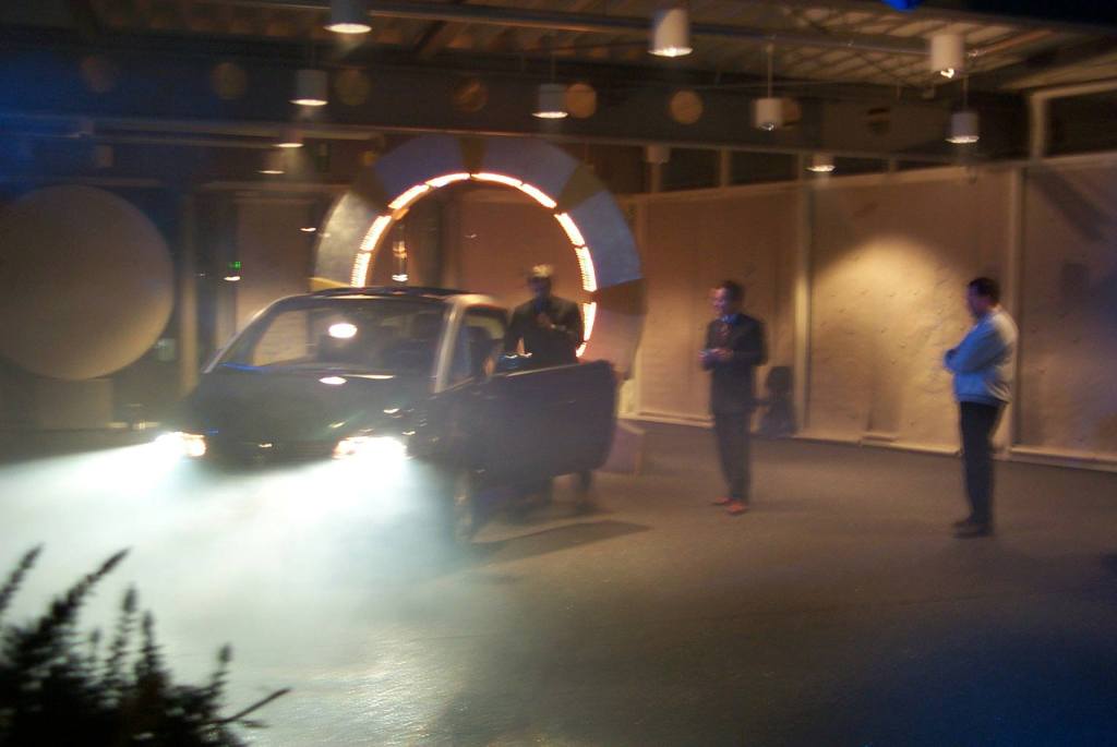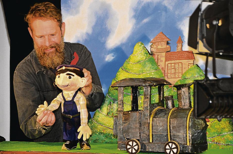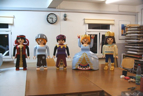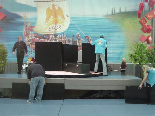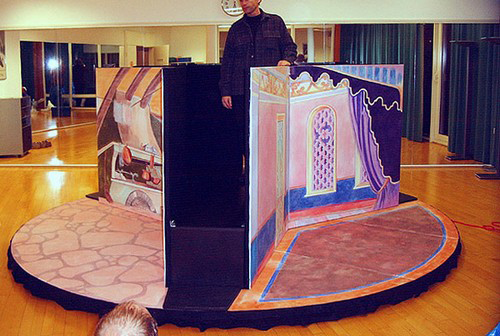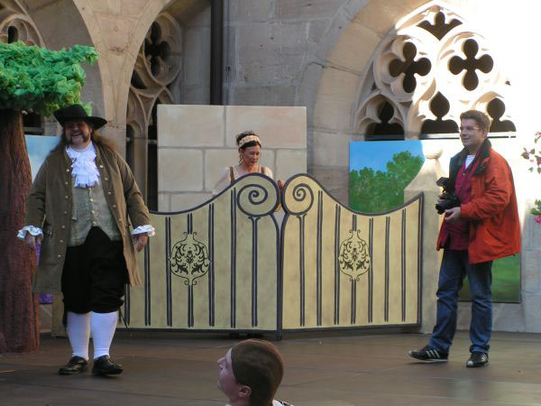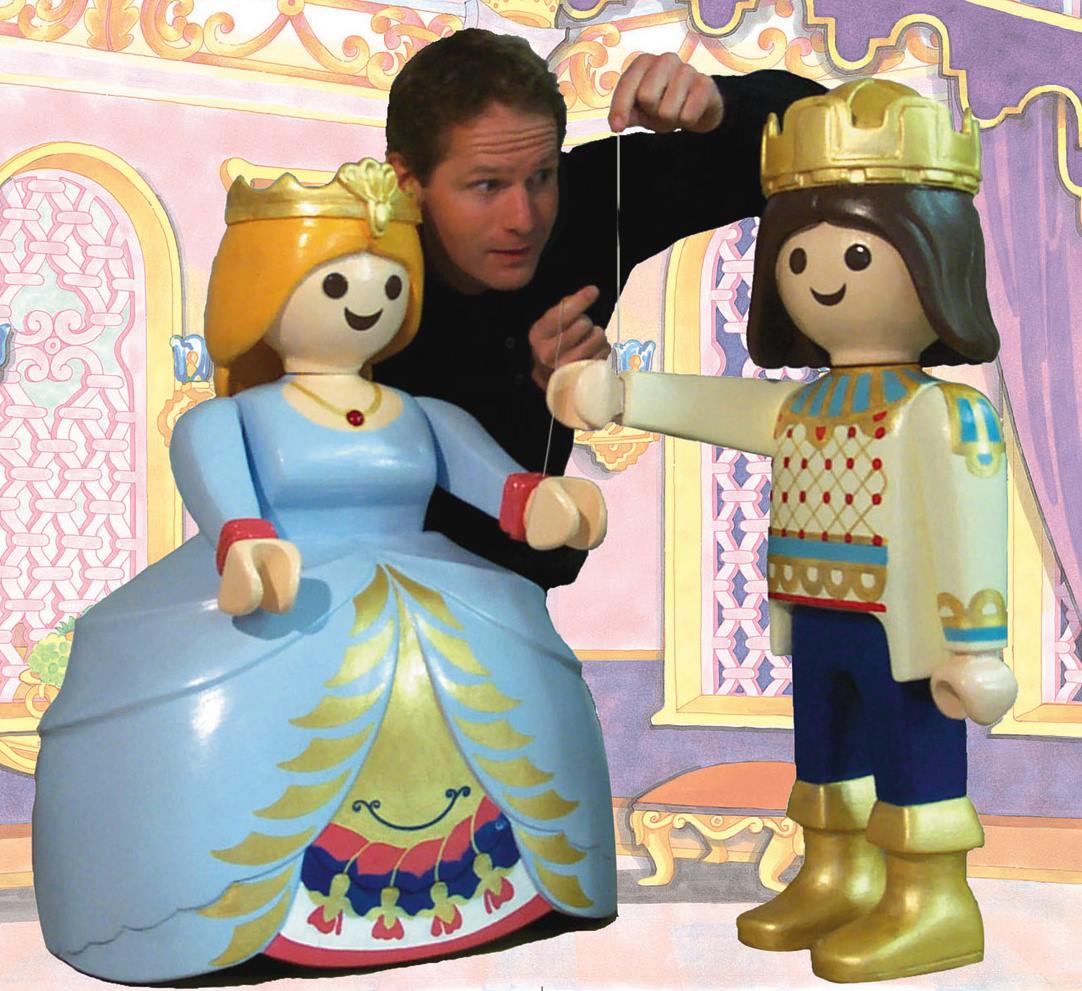 Autohaus Ullein Bamberg Event „Stargate“Produktion „Aschenputtel“ für Playmobil Funpark- 5 Figuren geschnitzt und bemalt + begehbare Drehbühne mit drei Kulissenbildern (Foto: zeigt Bernd Lang vom „Fantasie Theater“) – Technische und künstlerische Ausführung – Lothar R. BöhmEntwurf und Fertigung Tresen